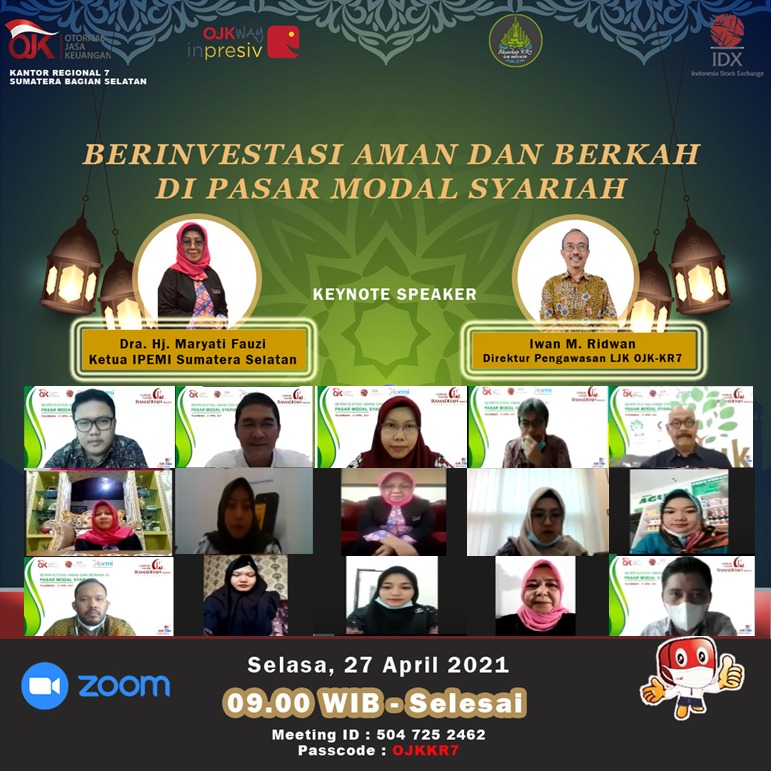 Pada giat webinar di hari pertama, Selasa 27 April 2021, OJK KR7 Sumbagsel menggandeng BEI Kpw Sumsel mengedukasi para pengusaha wanita yang tergabung dalam Ikatan Pengusaha Muslimah Indonesia (IPEMI) Sumatera Selatan dengan mengusung topik materi “Berinvestasi Aman dan Berkah di Pasar Modal Syariah”.Dalam kesempatan tersebut, para pengusaha muslimah diedukasi mengenai alternatif pembiayaan sekaligus alternatif investasi melalui pemanfaatan produk Pasar Modal Syariah, antara lain saham syariah, sukuk, reksadana syariah, layanan urun dana (securities crowdfunding), dan pemanfaatan Initial Public Offering (IPO) oleh UMKM. Selain itu, dipaparkan juga mengenai trik dan tips dalam berinvestasi yang aman dan berkah, sertaprinsip 2Ldalam berinvestasi, yaitu Legal dan Logis,agar terhindar dari investasi ilegal terutama dalam masa pandemi.