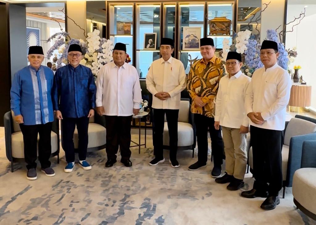 Tampak berjajar disamping Jokowi, Ketua Umum Partai Golkar Airlangga Hartarto, Ketua Umum Partai Gerindra Prabowo Subianto, Ketua Umum PAN Zulkifli Hasan, Ketua Umum PKB Muhaimin Iskandar, dan Plt Ketua Umum PPP Muhamad Mardiono.