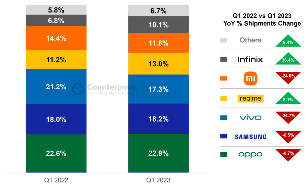 Laporan tersebut sekaligus menunjukkan bahwa realme menjadi satu-satunya Top 5 Smartphone brand di Tanah Air yang mencatatkan peningkatan. Secara keseluruhan pengiriman smartphone di Indonesia pada Q1 2023 mengalami penurunan 7,6% YoY. Momen Ramadan serta kehadiran realme C55 NFC berhasil meningkatkan penjualan berkat fitur-fitur yang diberikan. Sehingga bisa meningkatkan kembali gairah performa pasar yang pada akhirnya membawa realme ke prestasi membanggakan.