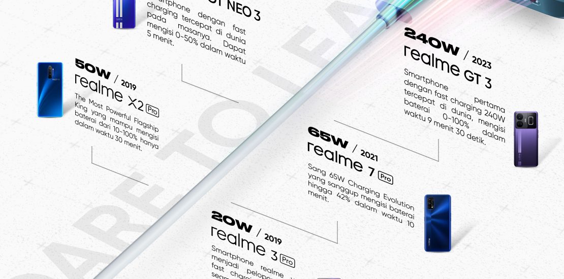 realme dikenal sebagai brand yang menggebrak dunia smartphone dengan teknologi fast charging. realme pertama kali memberikan teknologi pengecasan baterai 20W yang tertanam di smartphone mid-range realme 3 Pro pada tahun 2019. Di mana merupakan sebuah pencapaian terdepan saat itu dengan kompetitor hanya bermain di angka pengecasan 15W, dan kebanyakan masih eksklusif untuk smartphone kelas atas. Tidak berselang lama pada tahun yang sama, realme kembali menghadirkan inovasi teknologi melalui kecepatan pengecasan 50W di realme X2 Pro, menjadikan smartphone ini terdepan di kelasnya. realme buktikan bahwa teknologi pengisian daya cepat dan aman itu memungkinkan dan bisa dinikmati semua orang.