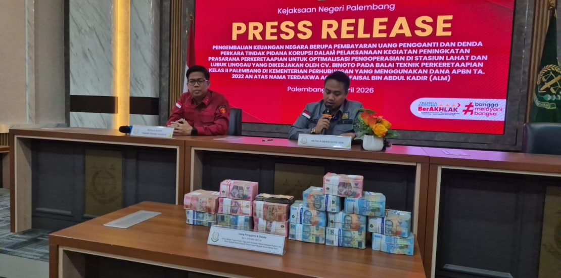 Palembang – Kejari Palembang menerima pembayaran uang pengganti dan denda dalam perkara tindak pidana korupsi proyek peningkatan prasarana perkeretaapian di Stasiun Lahat dan Lubuk Linggau, Rabu (1/4/2026).