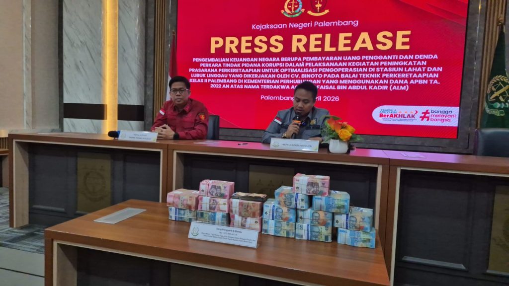 Palembang – Kejari Palembang menerima pembayaran uang pengganti dan denda dalam perkara tindak pidana korupsi proyek peningkatan prasarana perkeretaapian di Stasiun Lahat dan Lubuk Linggau, Rabu (1/4/2026).