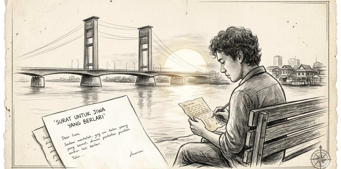 Lampu jalanan di tepian Sungai Musi mulai meredup saat aku akhirnya duduk di kursi kayu yang sudah mengelupas catnya. Di tanganku, ada secarik kertas lusuh yang kutemukan di selipan buku agenda lama. Tulisan di sana berantakan, ditulis oleh versiku sepuluh tahun yang lalu.